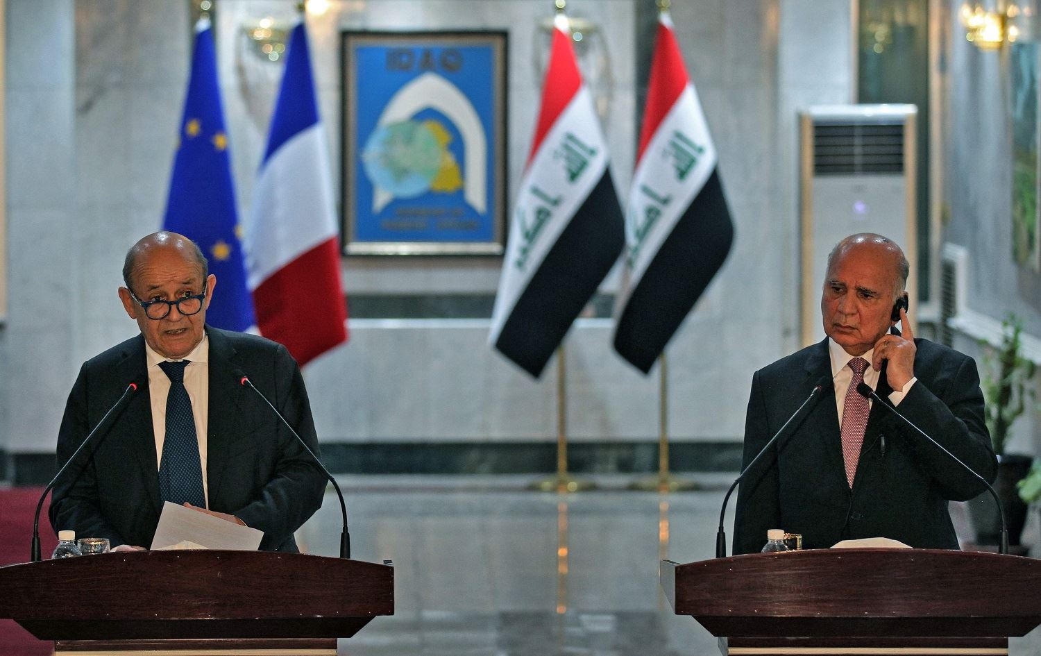 French Foreign Minister Jean-Yves Le Drian (L) and his Iraqi counterpart Fuad Hussein give a joint press conference in the Iraqi capital Baghdad, on July 16, 2020. Photo: Ahmad al-Rubaye/AFP