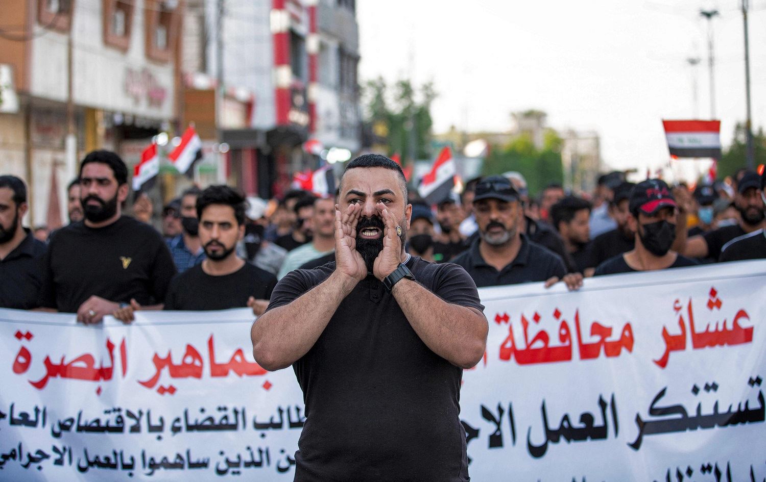 Supporters of the Hashd al-Shaabi paramilitary alliance chant slogans as they demonstrate outside the local headquarters of Iraq's Independent High Electoral Commission in Basra on November 9, 2021, demanding accountability for deaths of protesters outside the Green Zone in Baghdad. Photo: Hussein Faleh/AFP