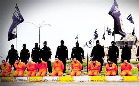 In three different pictures posted on the Internet, ISIS gunmen in black are seen standing behind a row of kneeling men in orange suits.