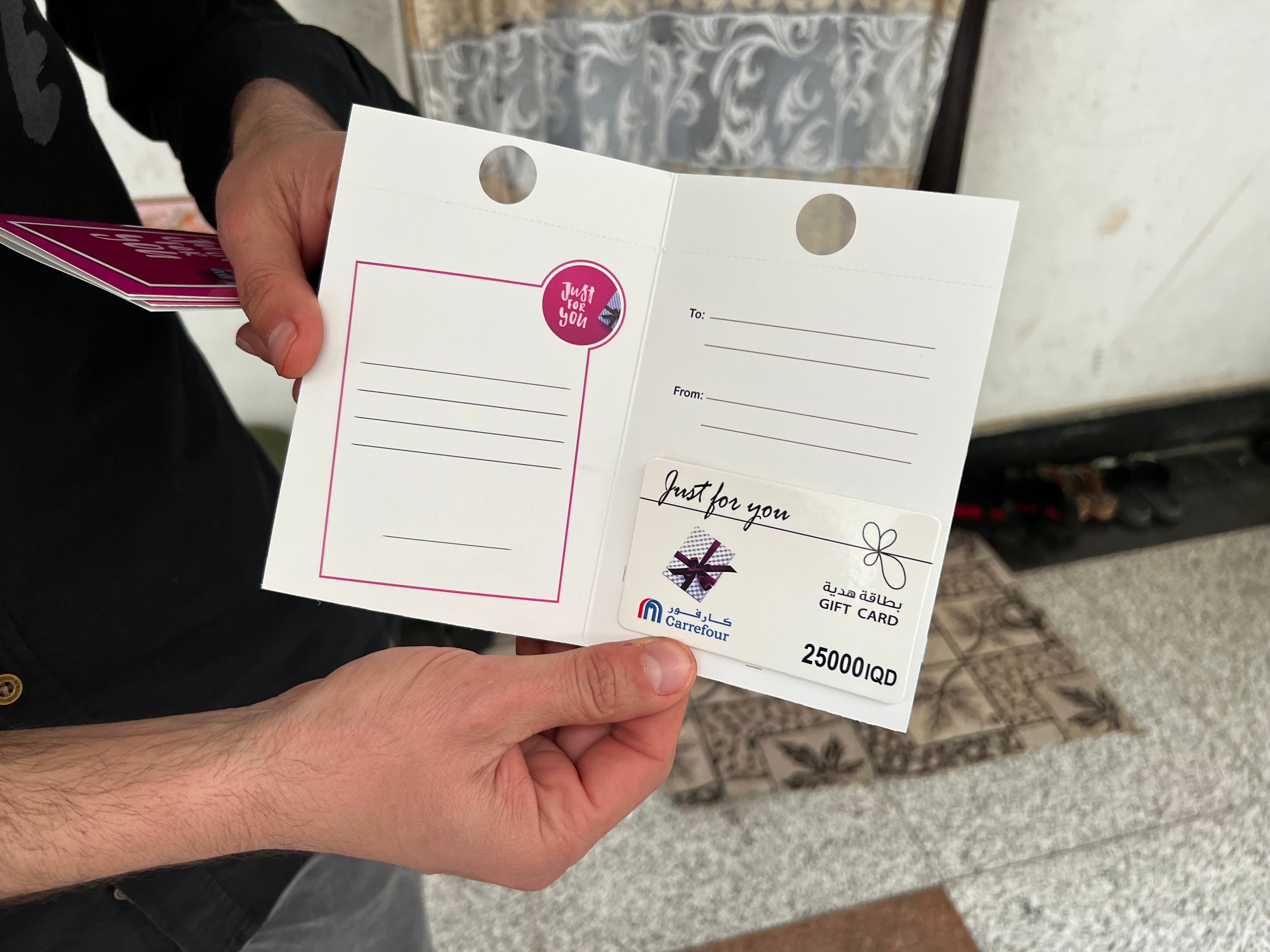 “I swear if I find a job, yes, I will return, but there are no jobs,” Mati said standing in front of their apartment’s door along with a neighbor, holding gift cards worth 25,000 dinars each, given to them to shop for groceries.