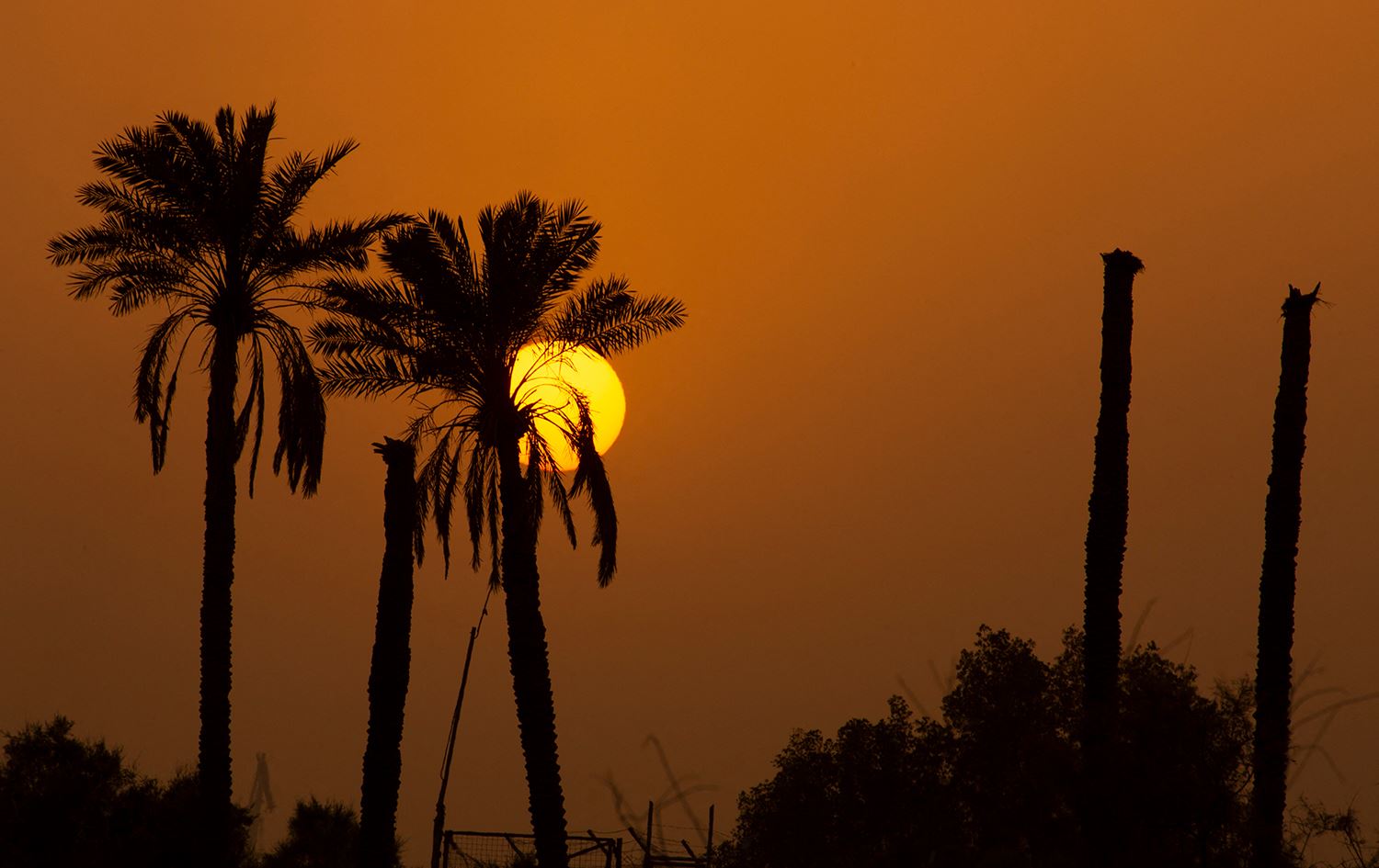 Damaged palm trees stand at sunset near the Shatt al-Arab waterway in the southern Iraqi city of Basra, on July 7, 2022. Once known as the "country of 30 million palm trees", and home to 600 varieties of the fruit, Iraq's date production has been blighted by decades of conflict and environmental challenges, including drought, desertification and salinisation. Photo: Hussein Faleh/AFP