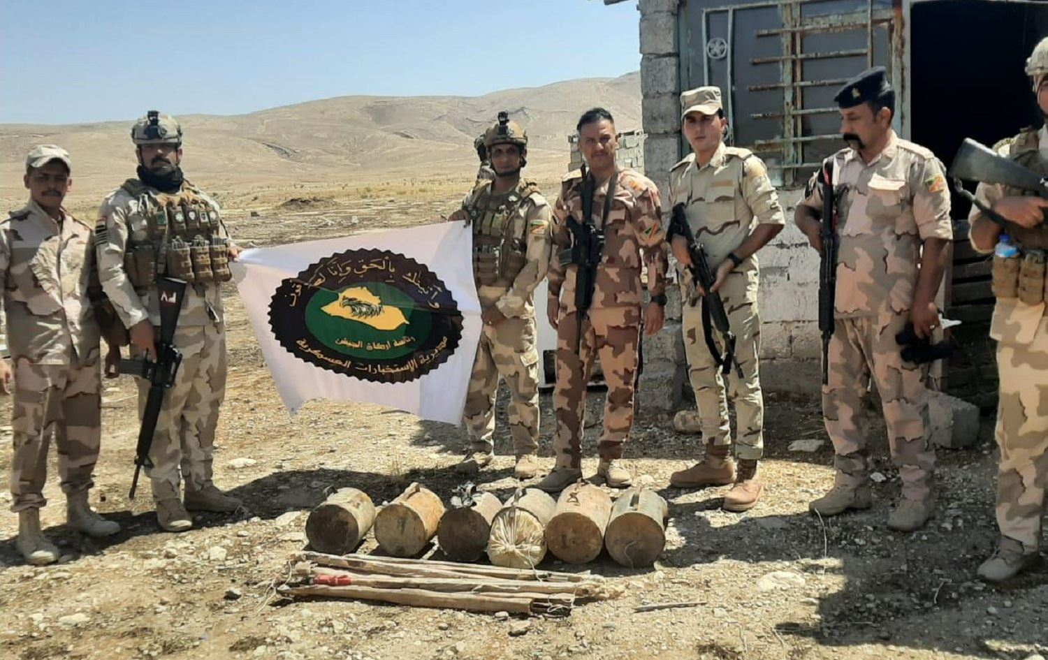 Iraqi forces pose with items seized during a raid on an ISIS hideout near Mount Qarachogh on August 17, 2021. Photo: handout/Security Media Cell