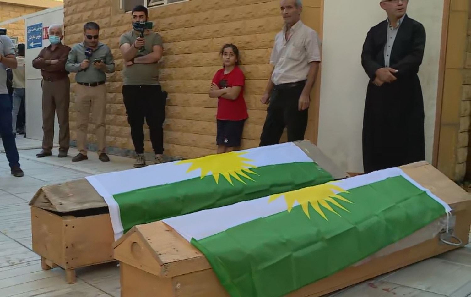 Coffins containing the bodies of two of the three family members killed at their home in Baghdad lie outside the Aha Sur mosque in Sulaimani on September 17, 2020. Photo: Rudaw