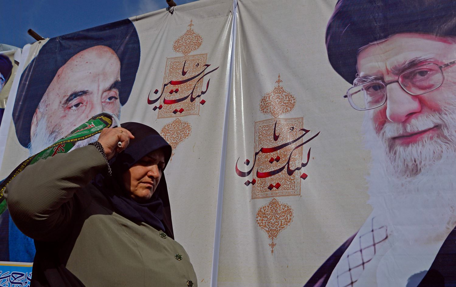 A Shiite Muslim pilgrim walks in front of posters of Iran's Supreme Leader Ayatollah Ali Khamenei (R) and the spiritual leader of the Shiite community Grand Ayatollah Ali Sistani, during a procession from the holy Iraqi city of Najaf to the central shrine city of Karbala, Iraq on October 12, 2019, ahead of the Arbaeen religious festival. Photo: Haidar Hamdani/AFP