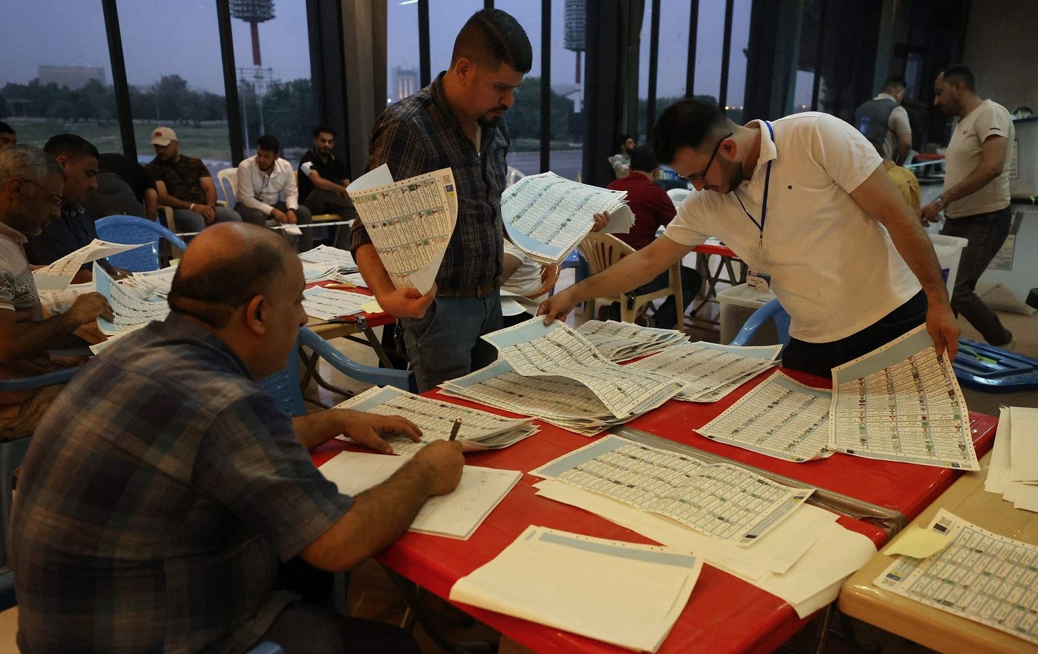 Employees of Iraq's Independent High Electoral Commission conduct a manual count of votes following the parliamentary elections in Baghdad's Green Zone area on October 13, 2021. Photo: Ahmad al-Rubaye/AFP