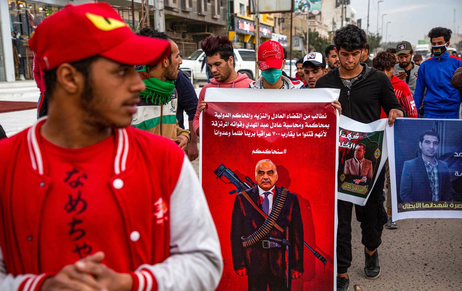 'We demand the fair and honest judiciary and the international courts to try and hold accountable Mr. Adil Abdul-Mahdi and his mercenary forces for unjustly killing almost 700 innocent Iraqis,' reads a banner depicting the prime minister as a sniper at a protest in Basra on January 17, 2020. Photo: Hussein Faleh/AFP