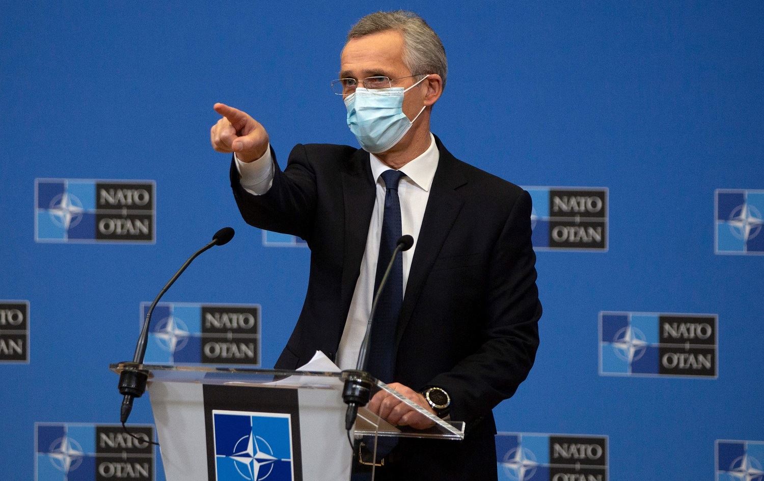 NATO Secretary General Jens Stoltenberg gestures during a press conference following a video conference with NATO Defence Ministers in Brussels on February 18, 2021. Photo: Virginia Mayo/pool/AFP