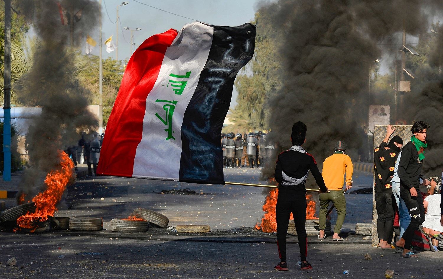 An anti-government protester waves the Iraqi flag during a demonstration in Najaf on March 14, 2021. Photo: Ali Najafi/AFP