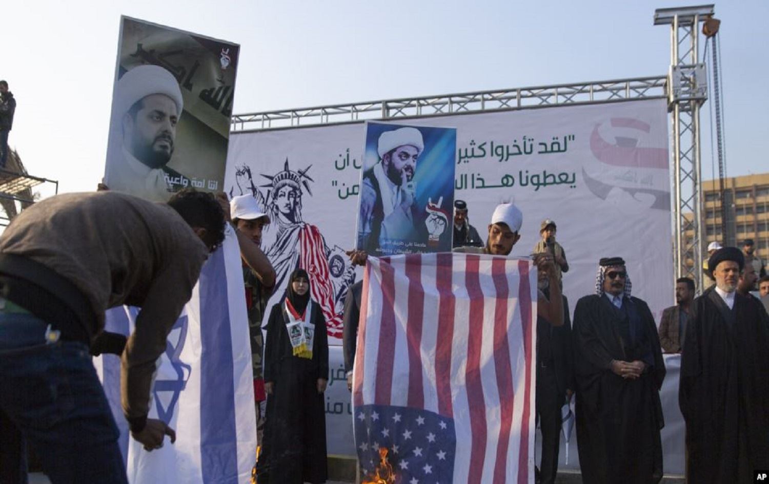 Iraqi protesters burn Israeli and US flags while others carry posters with pictures of Qais al-Khazali, during a rally for the Shiite group Asaib Ahl al-Haq, in Baghdad, Iraq, Saturday, Dec. 14, 2019. Photo: Nasser Nasser / AP