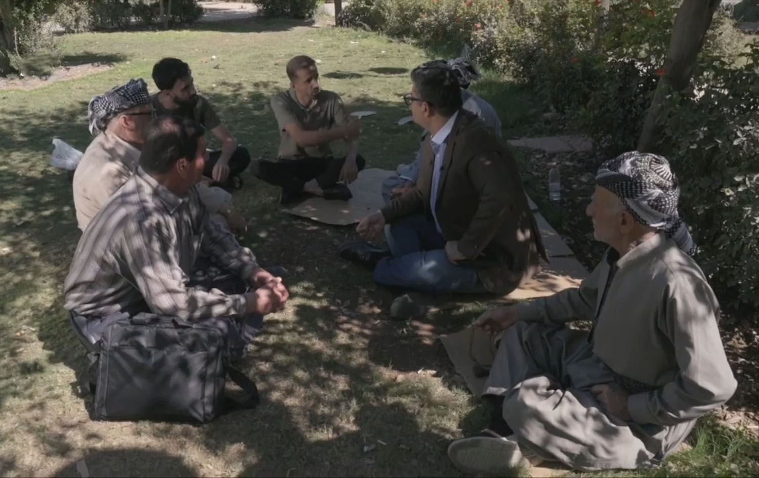 A group of men sitting and speaking under the shade of a tree in Ranya town, Sulaimani province, in October 2025. Photo: screengrab/Rudaw