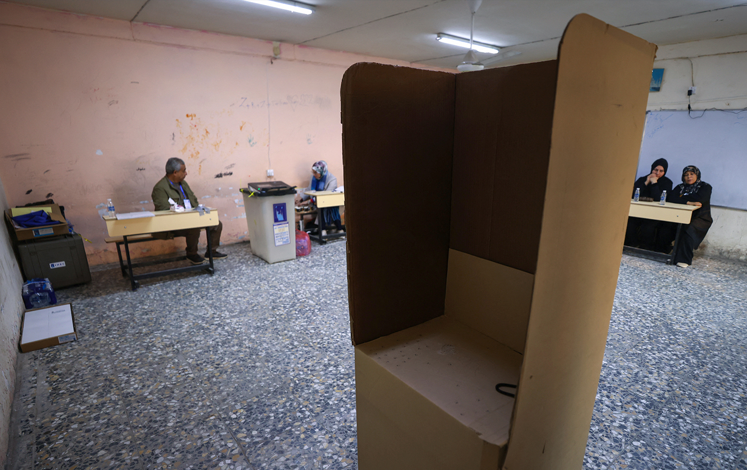Iraqi High Election Commission staff await voters in the election hall for the first provincial council elections in a decade, at a polling station in Sadr City in the capital Baghdad, on December 18, 2023. Photo: Ahmad al-Rubaye/AFP