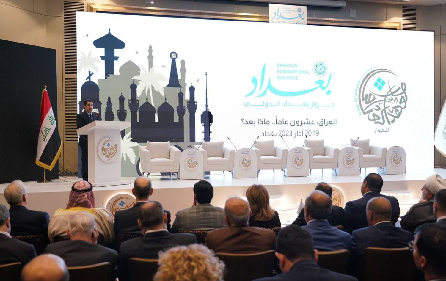 Iraqi Prime Minister Mohammed Shia' al-Sudani speaking at the Baghdad International Dialogue Conference on March 19, 2023. Photo: PM Sudani's office