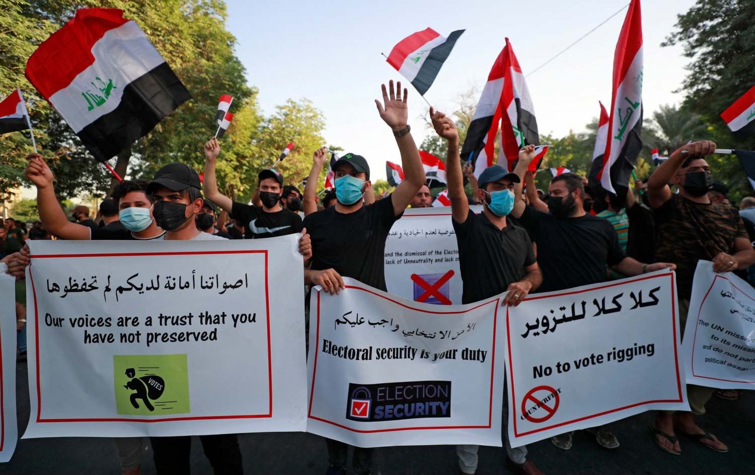 Supporters of the pro-Tehran militias with the Popular Mobilization Forces (PMF, or Hashd al-Shaabi in Arabic) gathered near the capital’s Green Zone area, home to government offices and diplomatic missions, expressing their anger and rejection of the preliminary results for the October 10 vote.