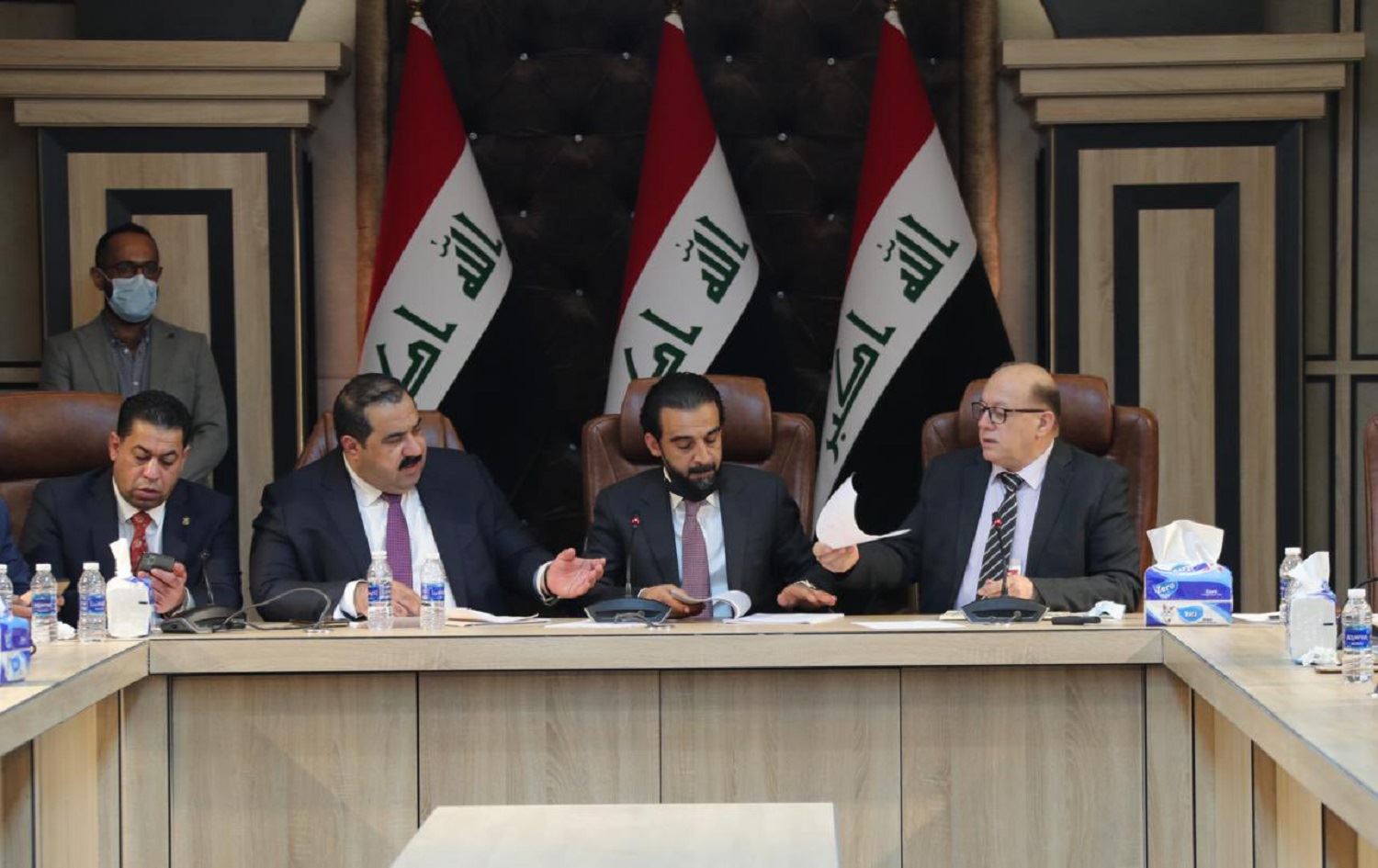 Parliament Speaker Mohammed al-Halbousi (second right) led last minute talks between political blocs on the 2021 budget on March 19, 2021. Photo: handout/Parliament Speaker’s media office