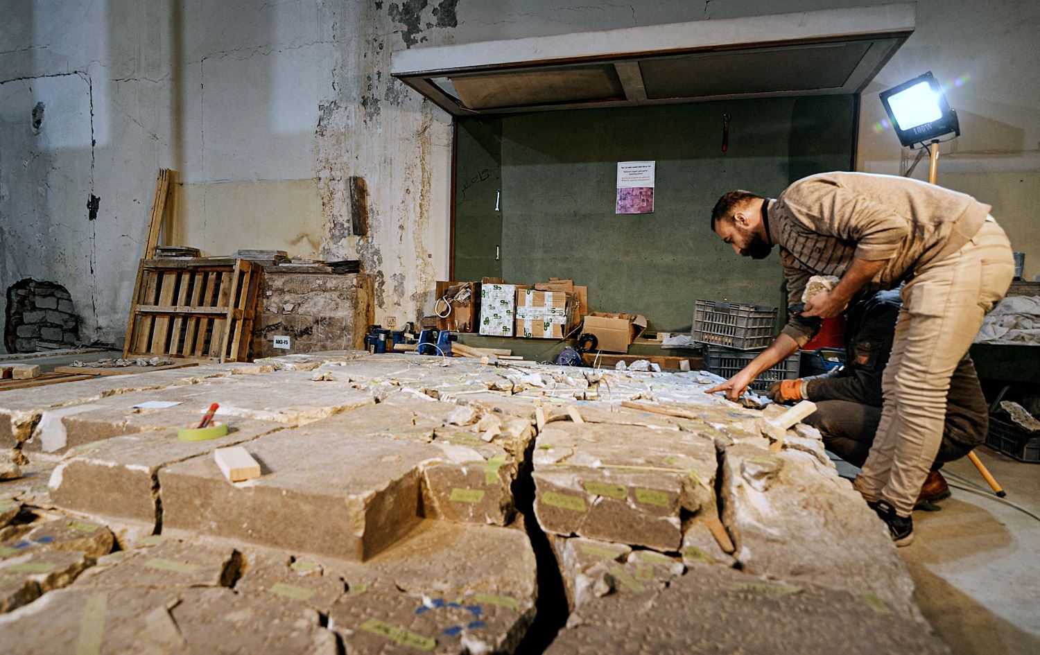 Workers at the Mosul Museum try to reassemble from broken fragments a larger artifact bearing cuneiform inscriptions on December 14, 2021. Photo: Zaid al-Obeidi/AFP