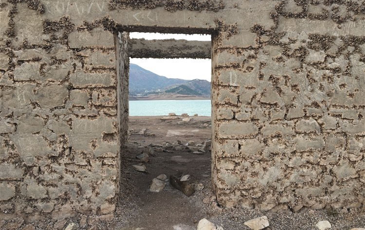 Duhok dam's depleting water levels, in the Kurdistan Region's Duhok province, taken in December 2021. The water is low enough that you can walk across and enter a previously submerged school. Photo: Alannah Travers/Rudaw