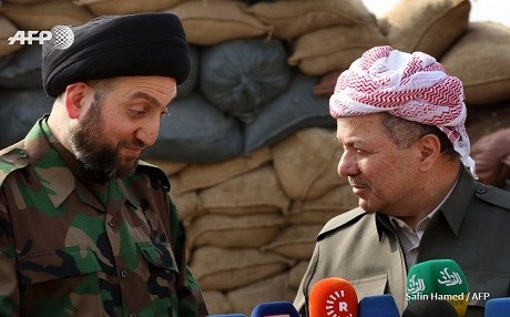 Kurdish President Masoud Barzani [R] and the head of the ruling Shiite National Alliance Ammar al-Hakim hold a joint press conference last October near Mosul where Iraqi and Kurdish forces launched a joint military operation to recapture Mosul from the ISIS group. Relations between the Kurdish and Shiite parties have historically been strong and friendly, especially with Hakim's Islamic Supreme Council. Photo: AFP.