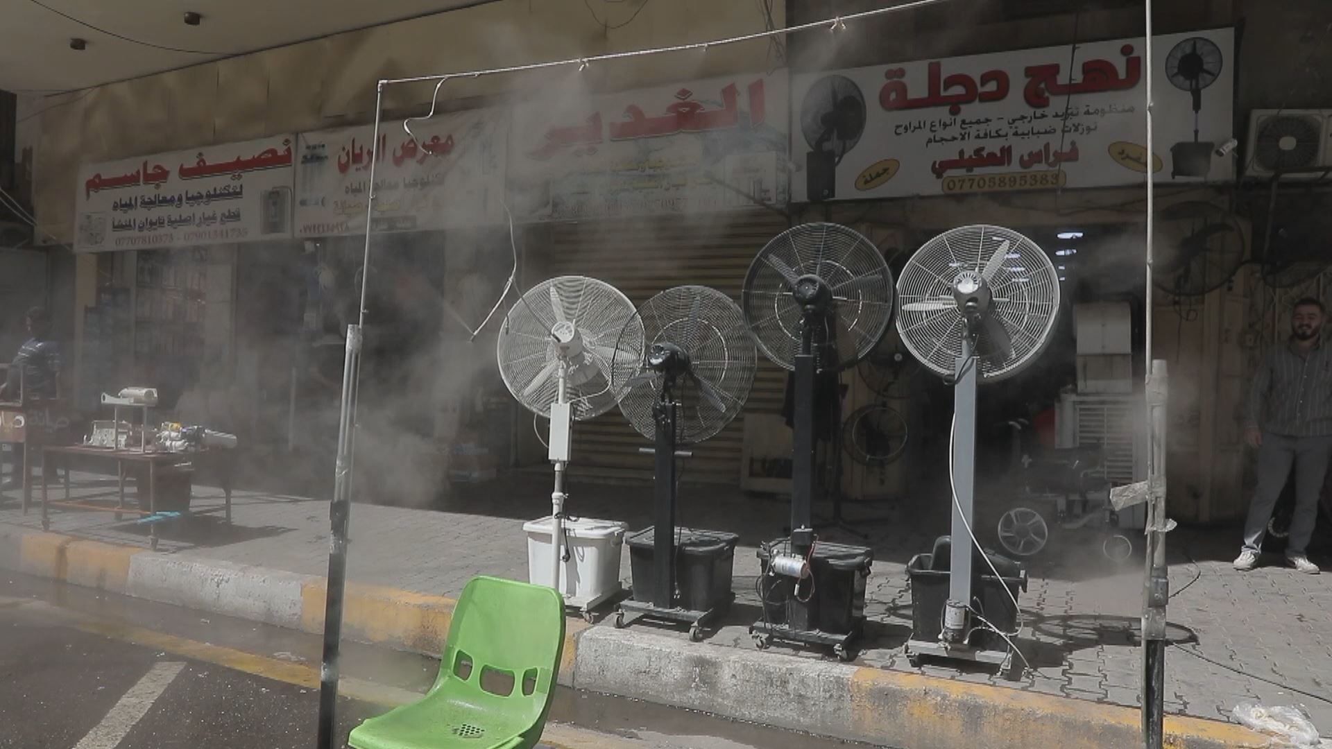 Shoppers and passersby in one of Baghdad's shopping districts are braving the heat with makeshift sprinkler systems and fans, saying they are struggling to cope with the heat amid the lack of electricity in the country.