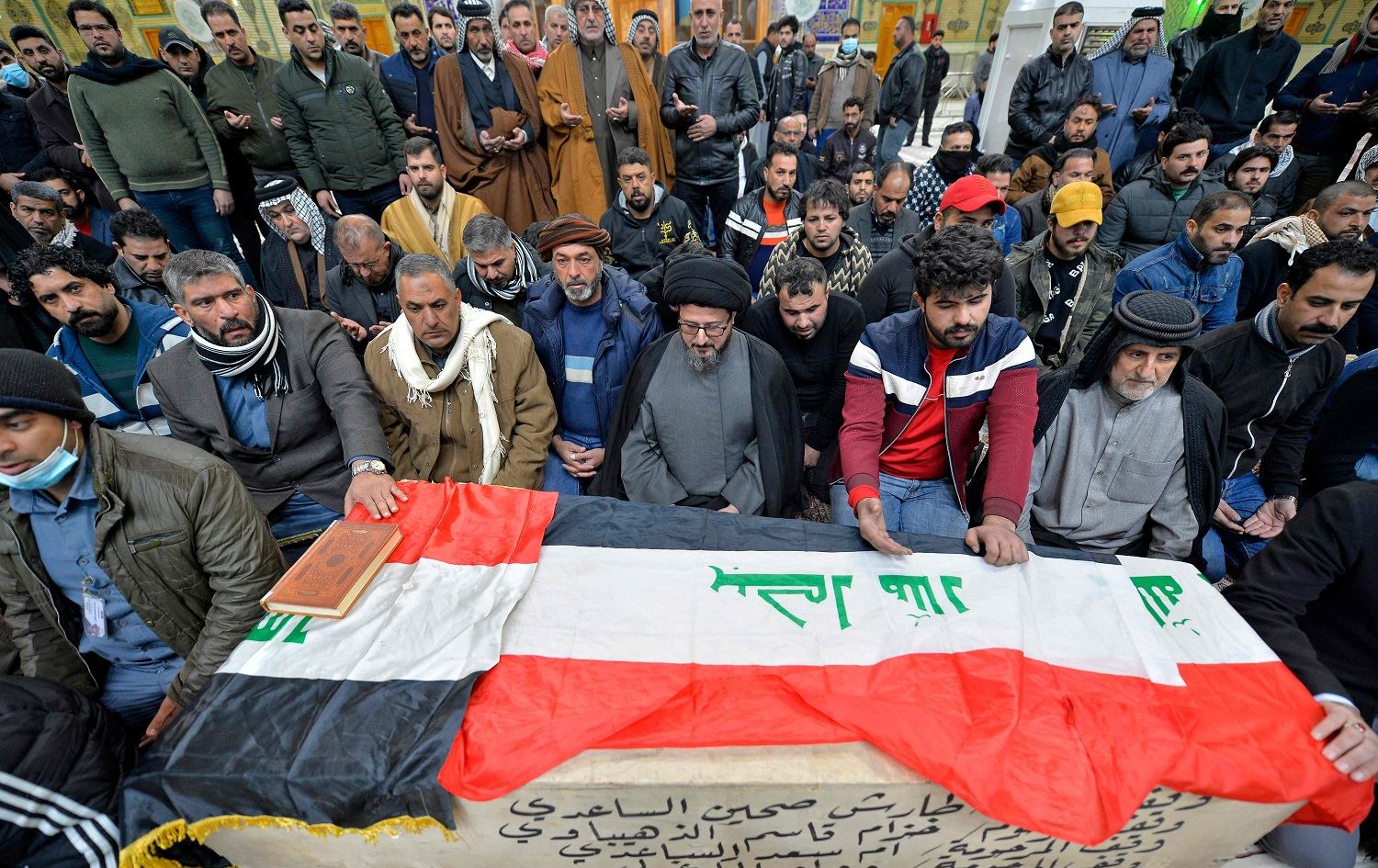 Iraqi mourners pray over the coffin of a victim who was killed in a twin suicide bombing in central Baghdad, during a funeral in the holy city of Najaf on January 21, 2021. Photo: Ali Najafi/AFP