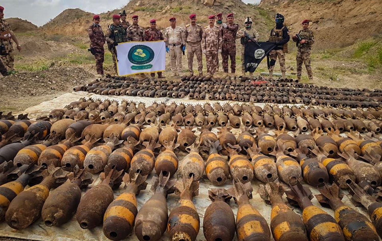 Iraqi Security Forces (ISF) pose with a captured Islamic State (ISIS) flag and explosives uncovered in al-Qaim, near the Iraq-Syria border, April 3, 2020. Photo: Iraqi defense ministry / social media