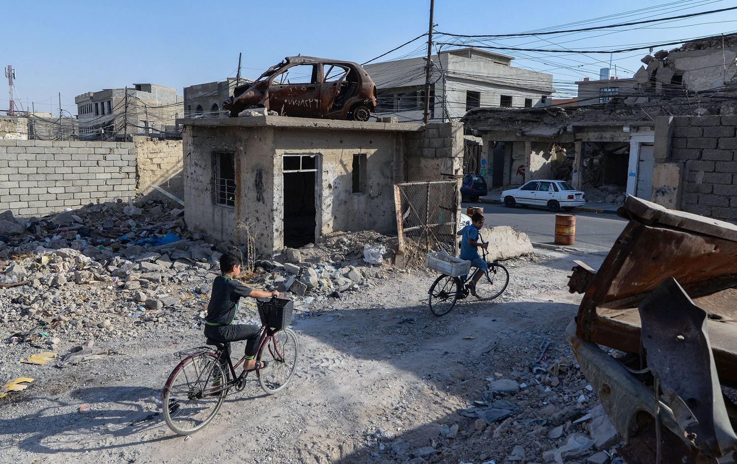 Iraqi boys ride bicycles on a street still full of rubble in Mosul, on the anniversary of the recapture of the northern Iraqi city from ISIS, on July 10, 2021. Photo: Zaid al-Obeidi/AFP