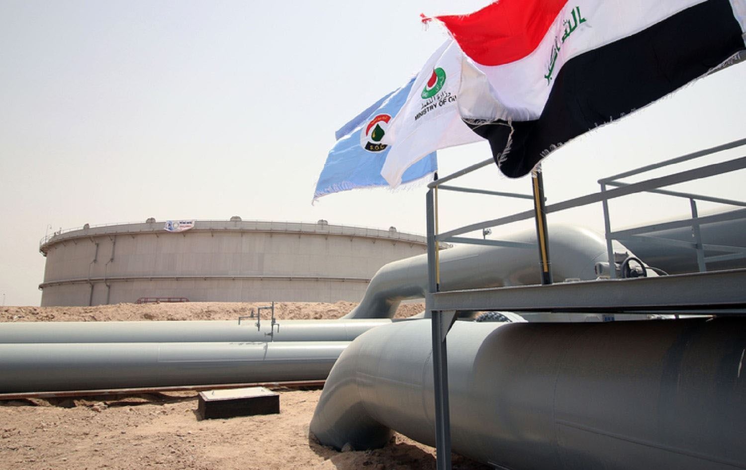 Flags flutter in front of an oil tank at al-Faw storage terminal, Basra province. File photo: AFP