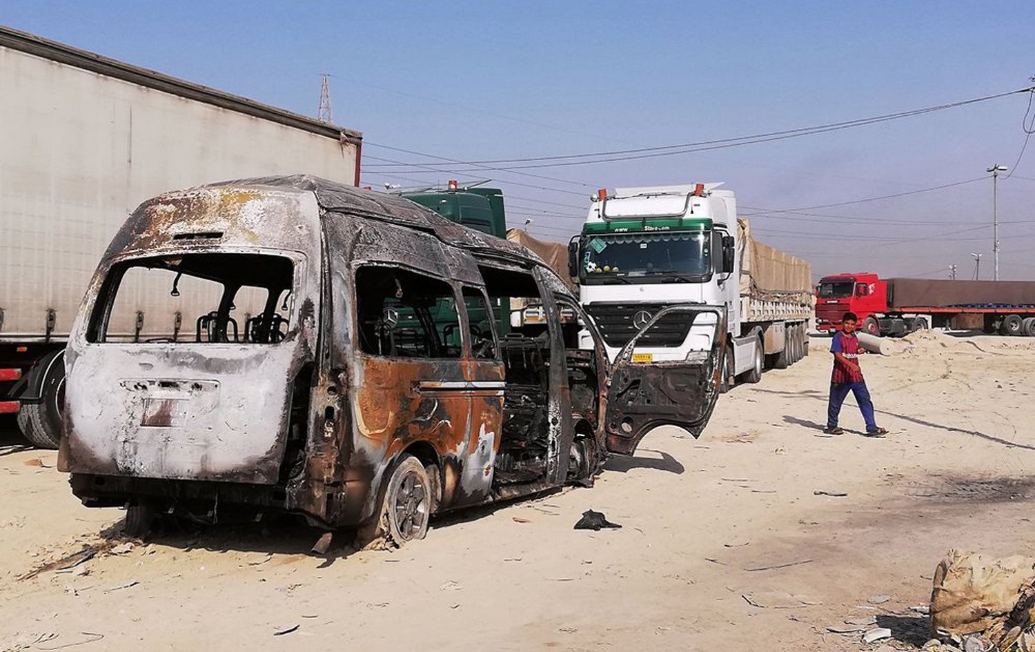 A destroyed minibus sits near an Iraqi army checkpoint about 10 kms. (6 miles) south of Karbala, Iraq, September 21, 2019. Photo: Hadi Mizban / AP