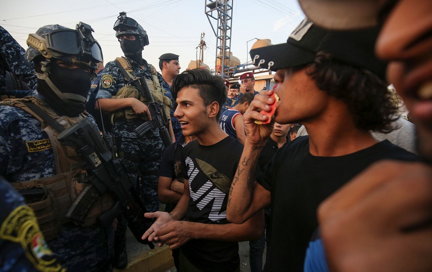 Iraqi protesters speak with members of police in Baghdad's predominantly Shiite Sadr City, October 7, 2019. Photo: Ahmad al-Rubaye / AFP