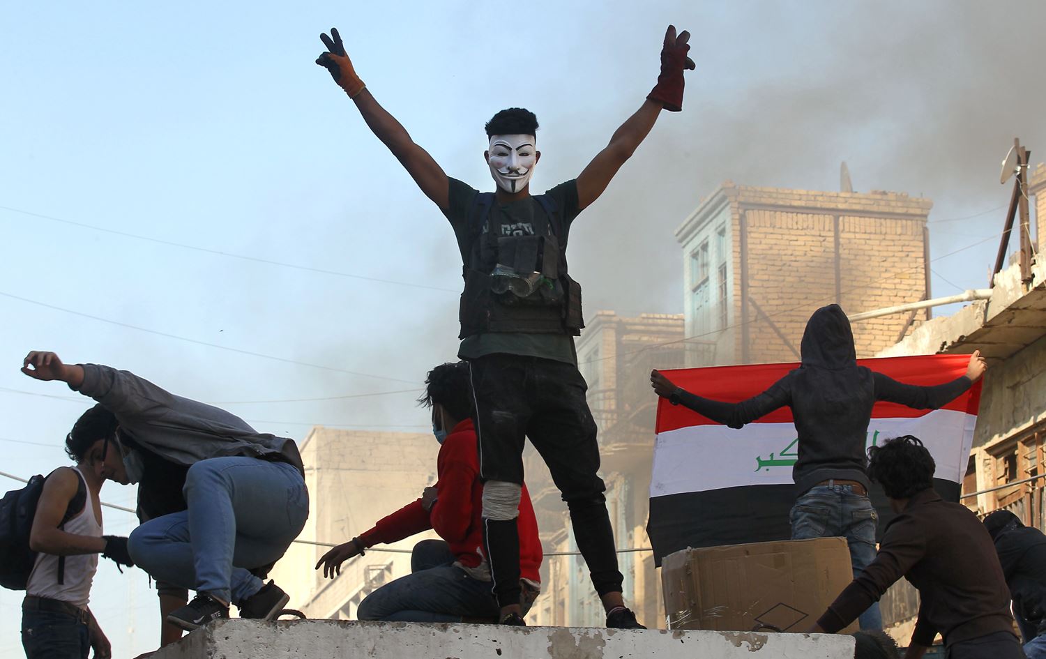 A demonstrator wearing a Guy Fawkes mask gestures in Baghdad's al-Rasheed street near al-Ahrar bridge on November 22, 2019. Photo: Ahmad al-Rubaye/AFP