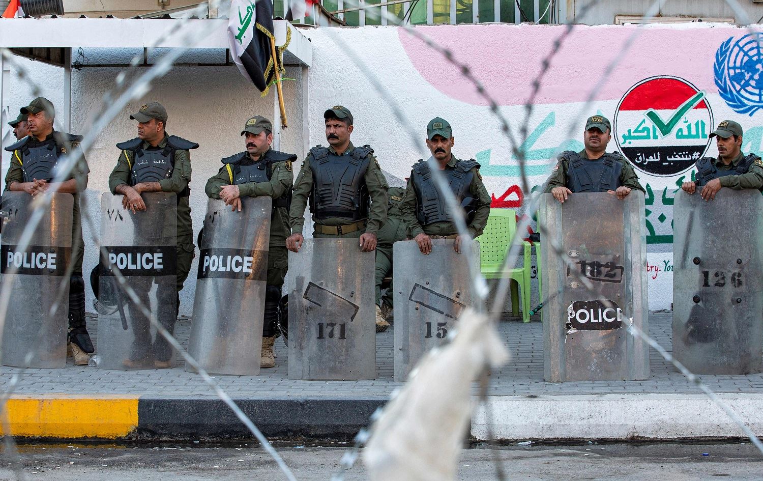 Iraqi security forces members stand guard outside the local headquarters of the Independent High Electoral Commission in Basra on November 9, 2021, as supporters of the PMF demonstrate nearby. Photo: Hussein Faleh/AFP