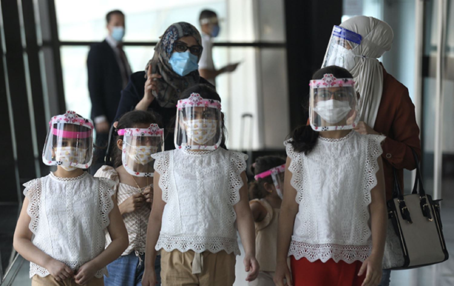 An Iraqi family wearing protective masks walk through the departure hall of Baghdad International Airport in July 2020. Photo: AFP