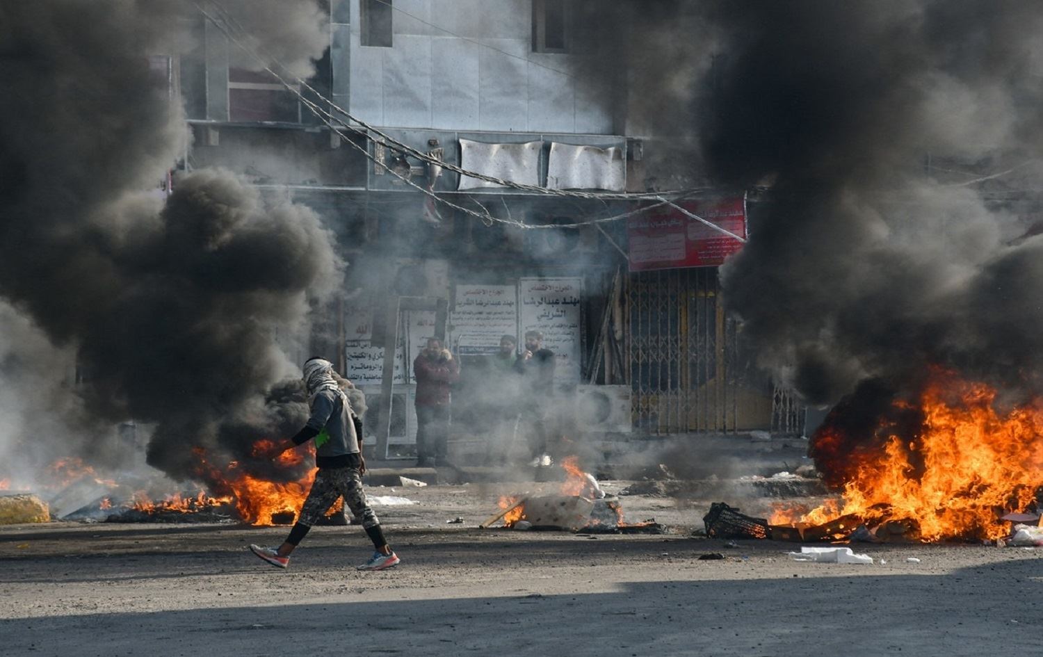 An man walks past burning tires during clashes with police in Nasiriyah on January 10, 2021. Photo: AFP