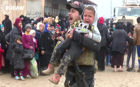 Some families trying to flee are being separated. An Iraqi soldier carrying a child in his arms walked through a crowd of displaced persons asking who the child belongs to.