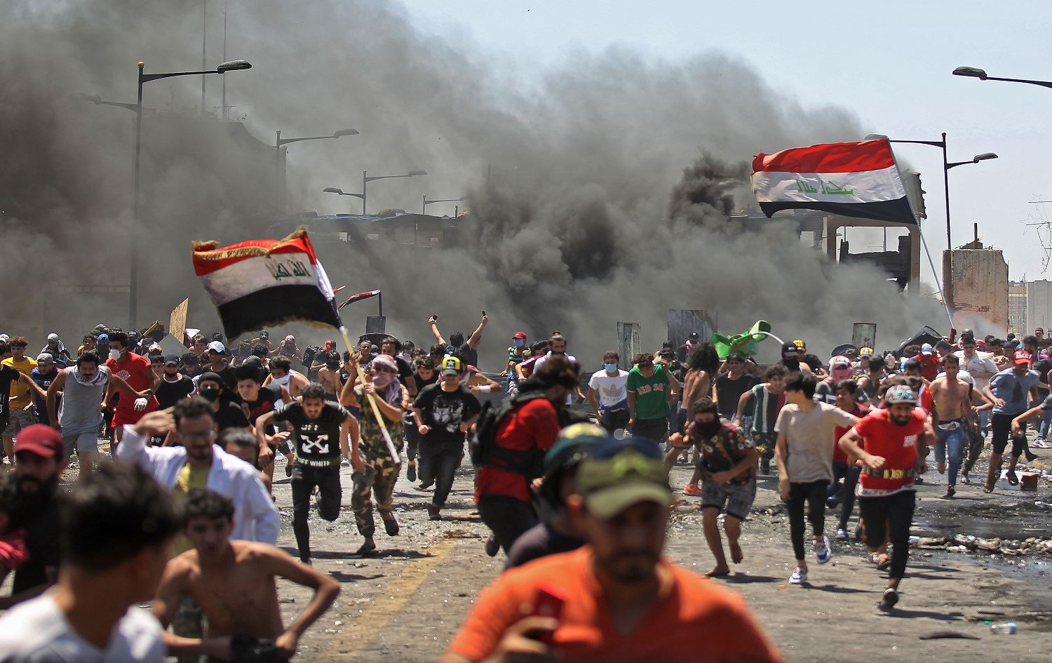 Iraqi protesters run for cover as they clash with security forces on Al-Jumhuriyah bridge, Baghdad, during an anti-government demonstration on May 10, 2020. Photo: Ahmad al-Rubaye/AFP