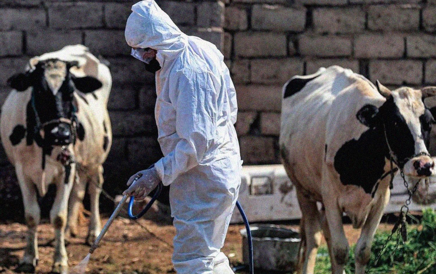 An employee of the Iraqi health ministry's veterinarian department disinfects, as a precaution against the spread of Congo haemorrhagic fever, past cows at a farm in the southwestern Baghdad suburb of al-Bouaitha on May 22, 2023. Photo: AFP