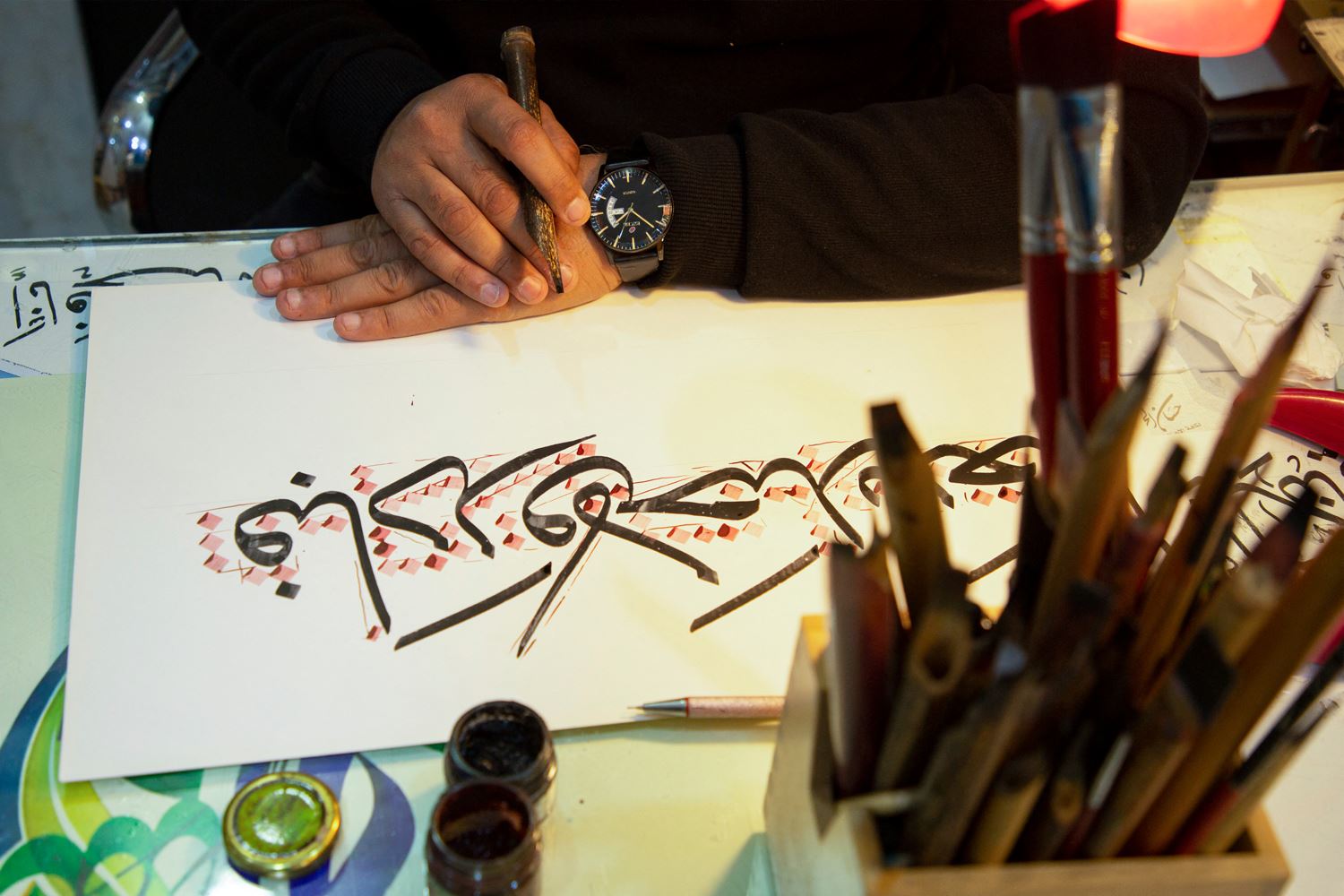 Iraqi calligrapher Wael Ramadan uses a stylus to produce a sample of Arabic calligraphy at his workshop in al-Ashar district of Iraq's southern city of Basra on December 21, 2021.
