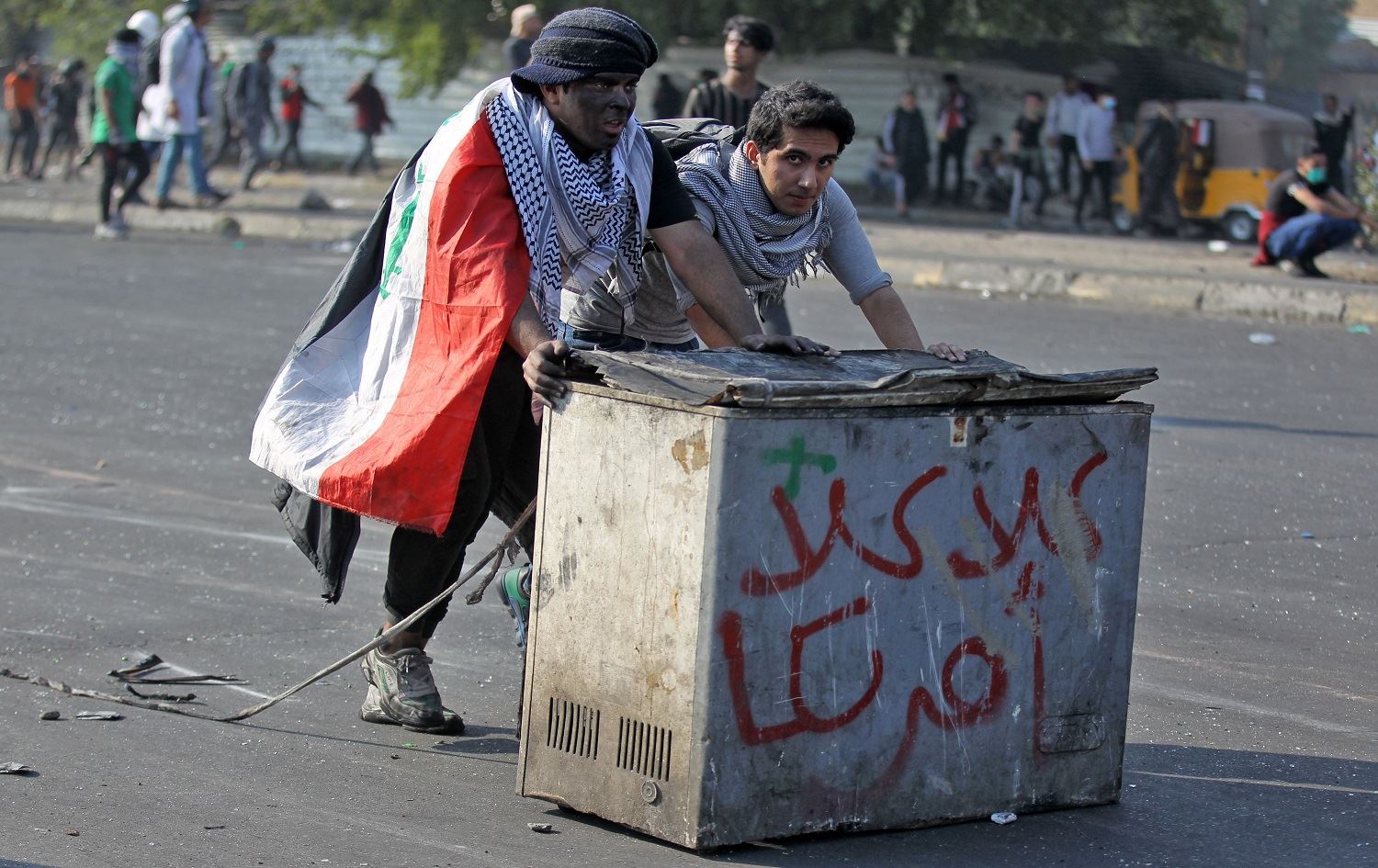 Iraqi protesters push a freezer with writing reading "No No America" amid clashes with riot police in Baghdad on January 20, 2020. Photo: Ahmad al-Rubaye/AFP