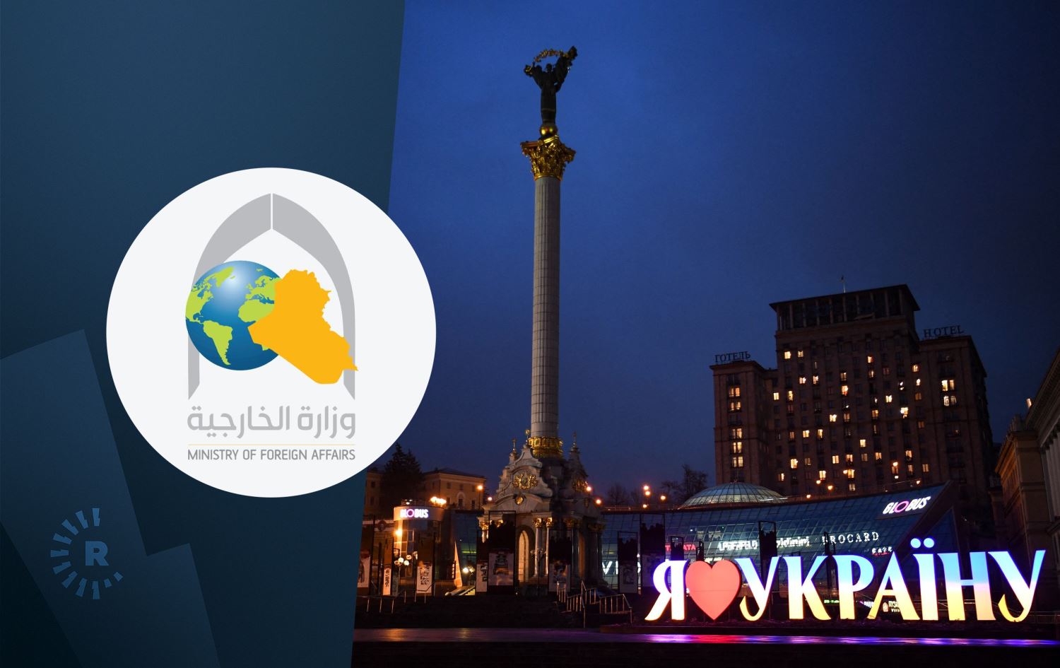 A view of (right) the Independence Monument and a sign "I love Ukraine" in central Kyiv on February 24, 2022. Photo: AFP. Logo of the Iraqi foreign ministry. Graphic: Rudaw