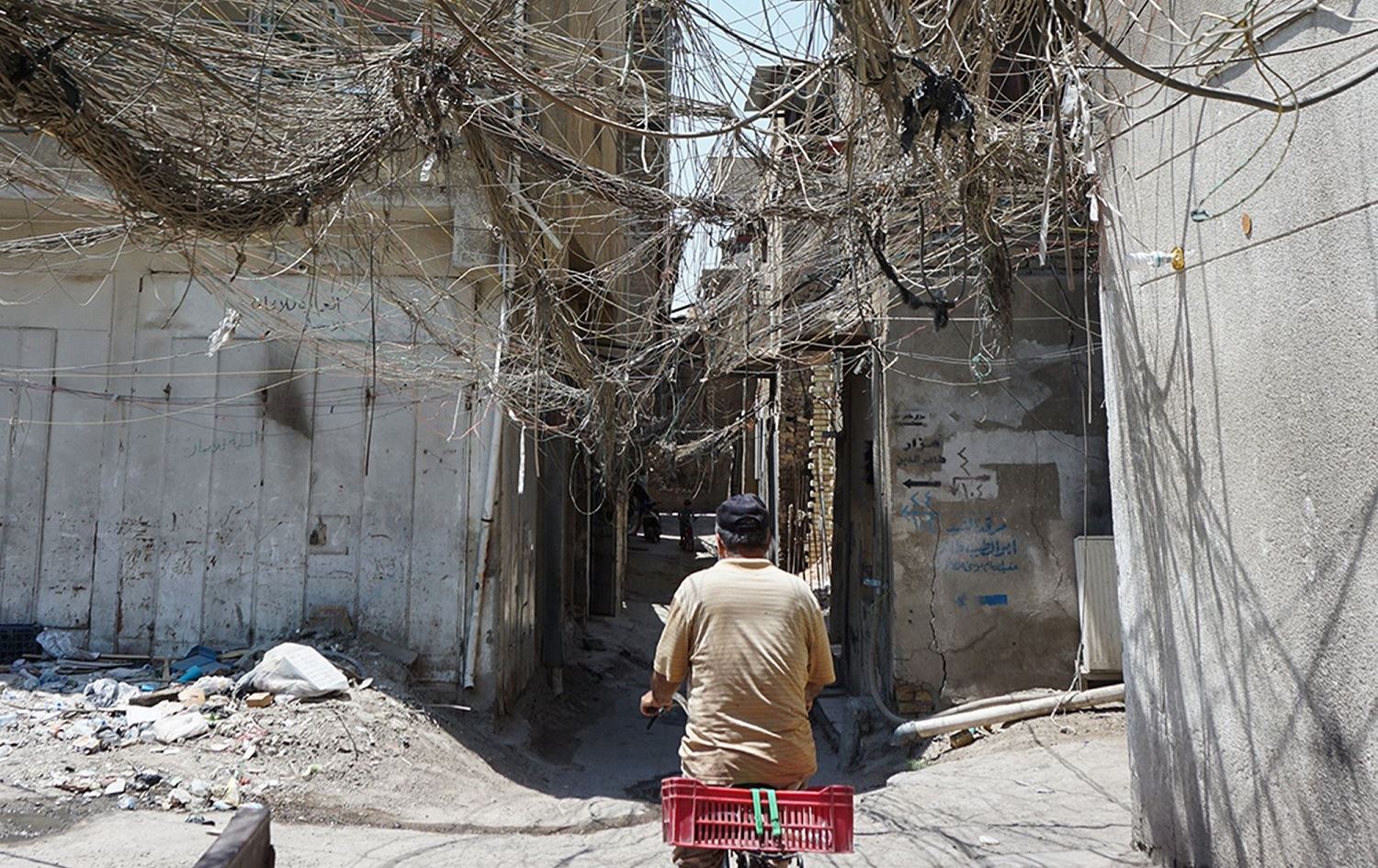 An Iraqi man rides a bicycle beneath a web of electric wires in the Syed Sultan Ali area of the capital Baghdad, on July 13, 2020, used to draw electricity from private generators due to an unreliable national electricity supply amid high temperatures. Photo: Sabah Arar/AFP