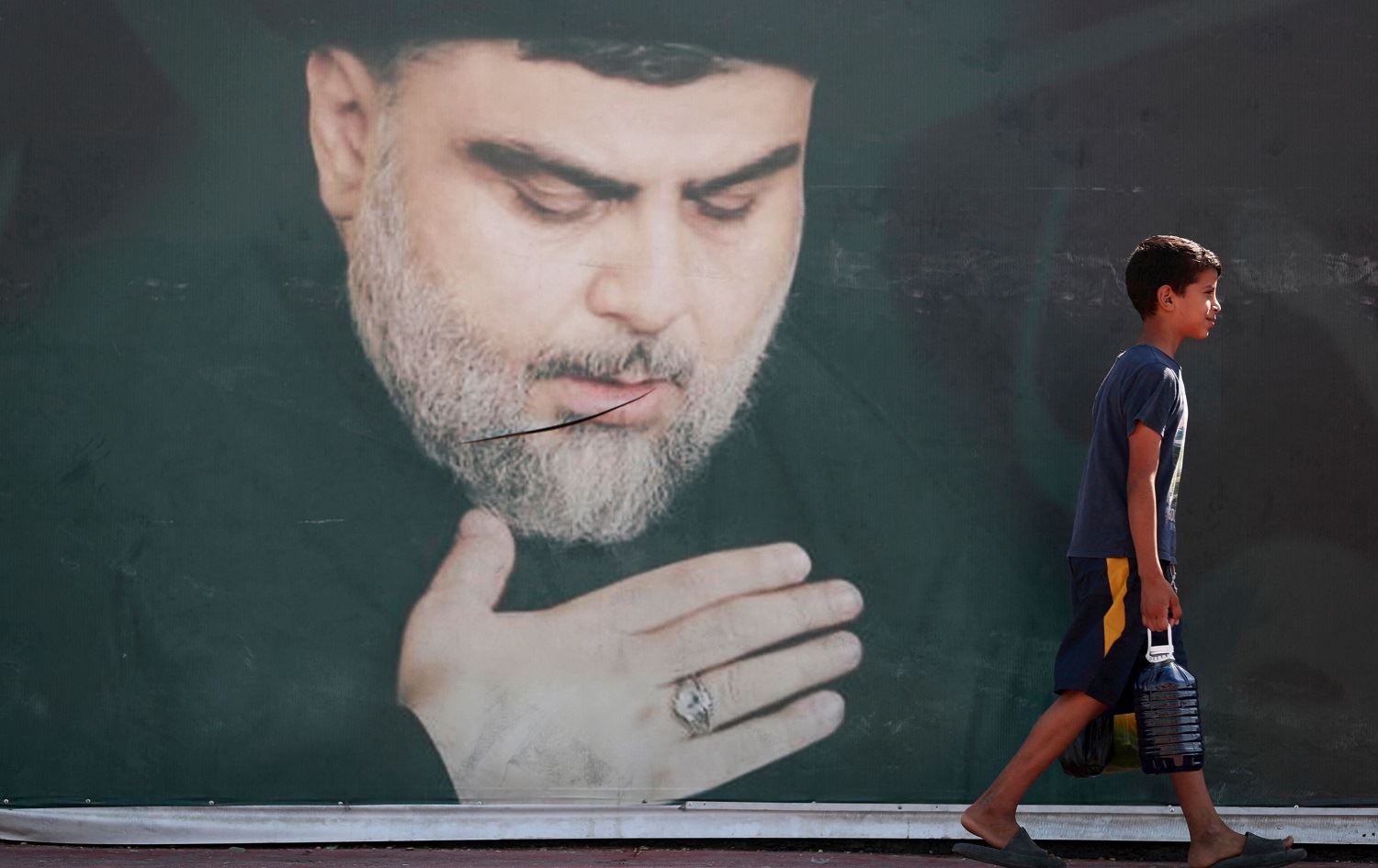 An Iraqi child walks past a poster of Shiite cleric Muqtada al-Sadr in Baghdad's Sadr City on October 17, 2021. Photo: Ahmad al-Rubaye/AFP