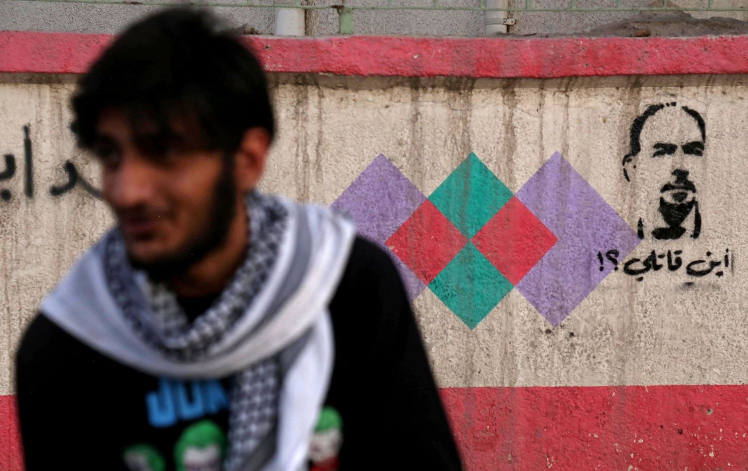 An Iraqi sits in front of graffiti in Karbala on May 23, 2021 reading in Arabic "Where's my killer?" and depicting anti-government activist Ihab al-Wazni who was shot dead earlier this month. Photo: Mohammed Sawaf/AFP
