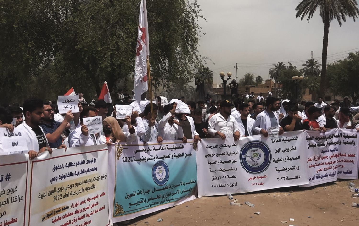 "We, graduates of the 2022 class, came to Baghdad. When we submitted the application form for employment in accordance with Law No. 6 of 2000, we were surprised that 25,000 graduates were not included, contrary to the law that entitles all specialties of medicine, pharmacy, and medical institutes to employment...," Hussein, a graduate protester said.