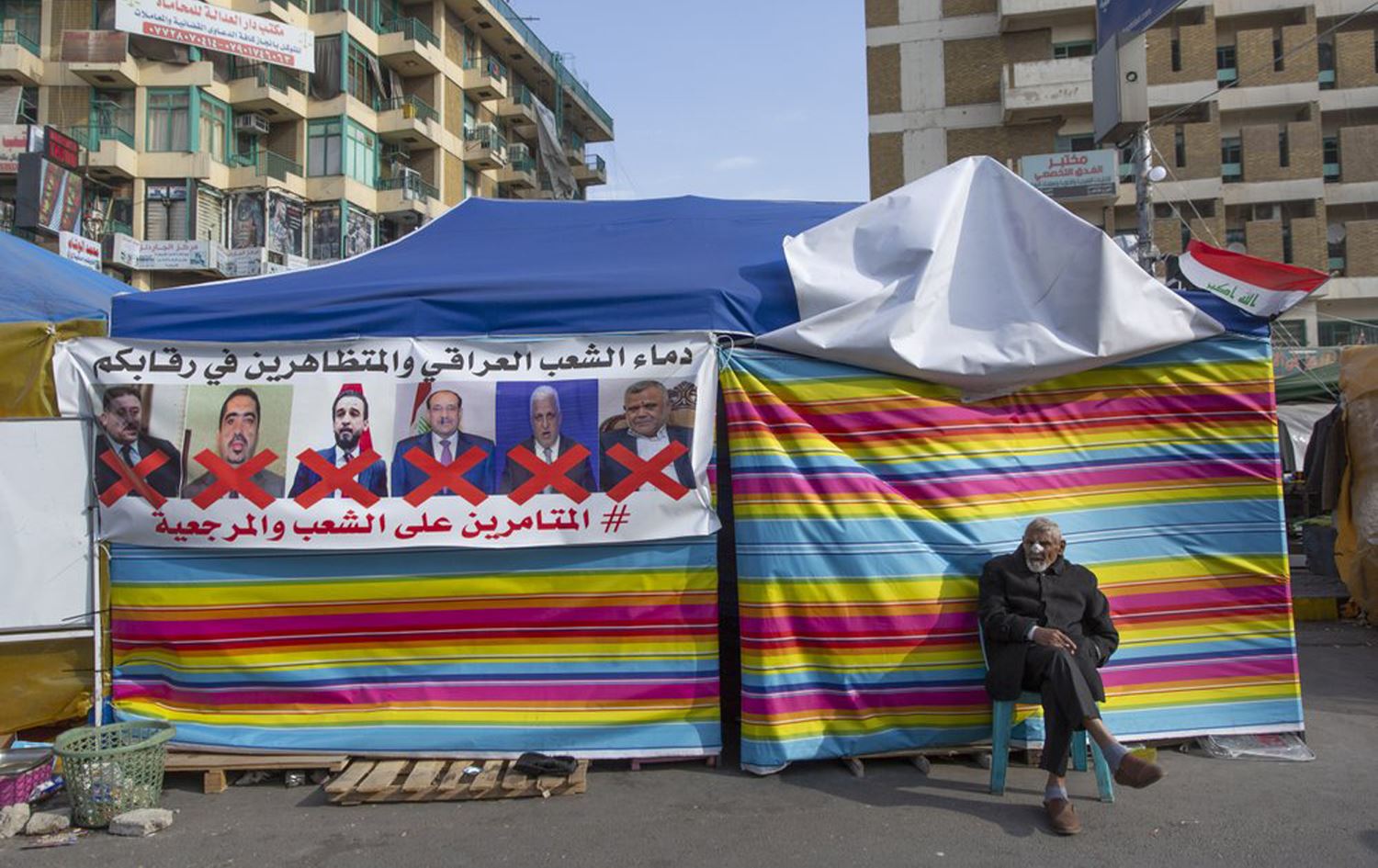 A protester sits next to a poster with defaced pictures of Iraqi politicians that reads, "the blood of the Iraqi people and the protesters is on your necks." Tahrir square, Baghdad, Iraq, Wednesday, Dec. 25, 2019. Photo: Nasser Nasser/ AP