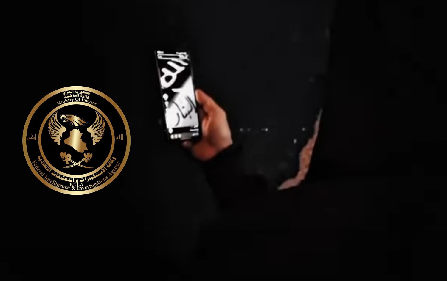 Iraqi Federal Intelligence and Investigations Agency logo and a screengrab of footage it published when announcing arrest of two people over ISIS slogans on December 24, 2025. Graphic: Rudaw