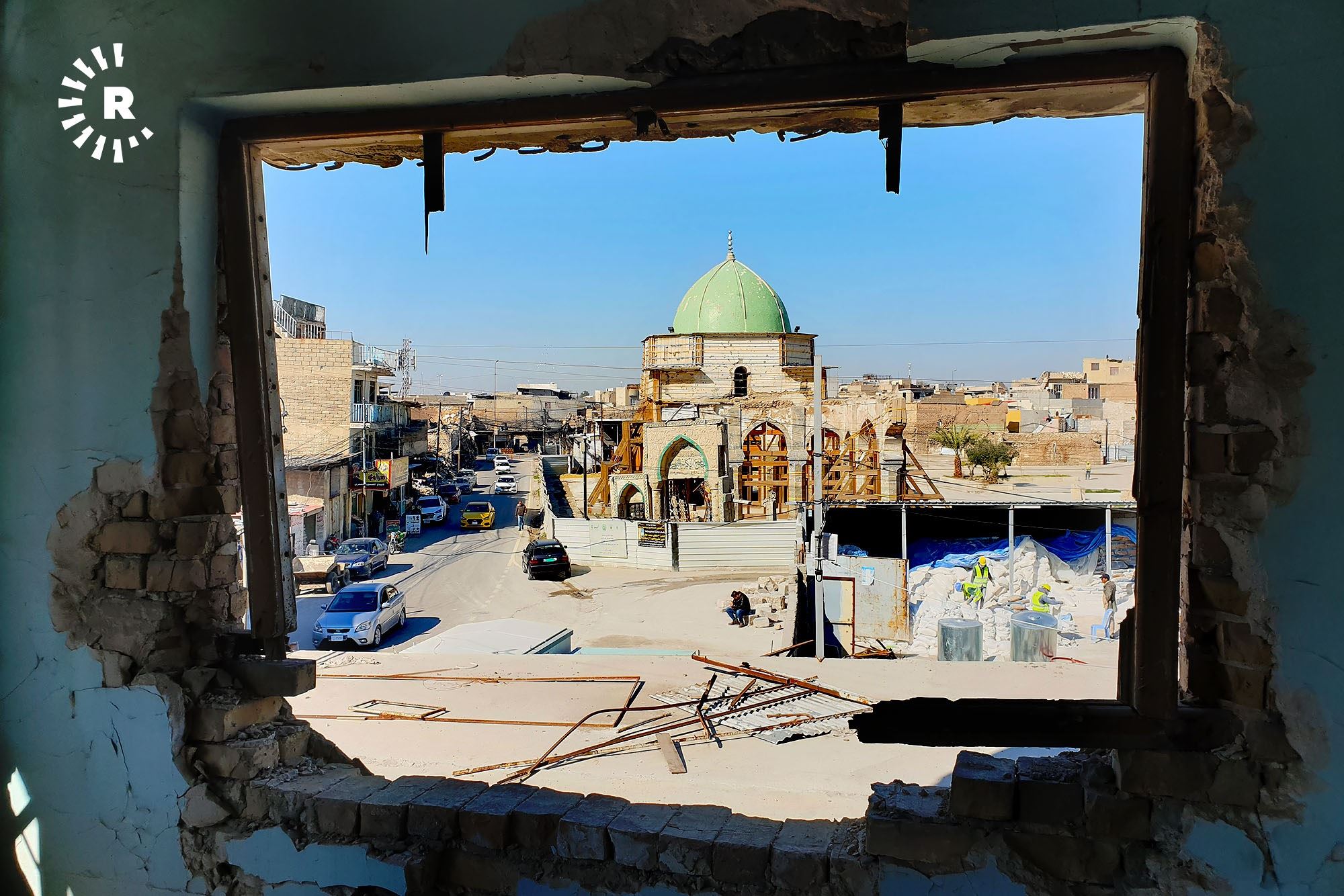 View of the fenced off al-Nuri Mosque and its complex on February 23, 2021, as seen from the window frame of a building destroyed during the battle of Mosul. Photo: Khazan Jangiz / Rudaw