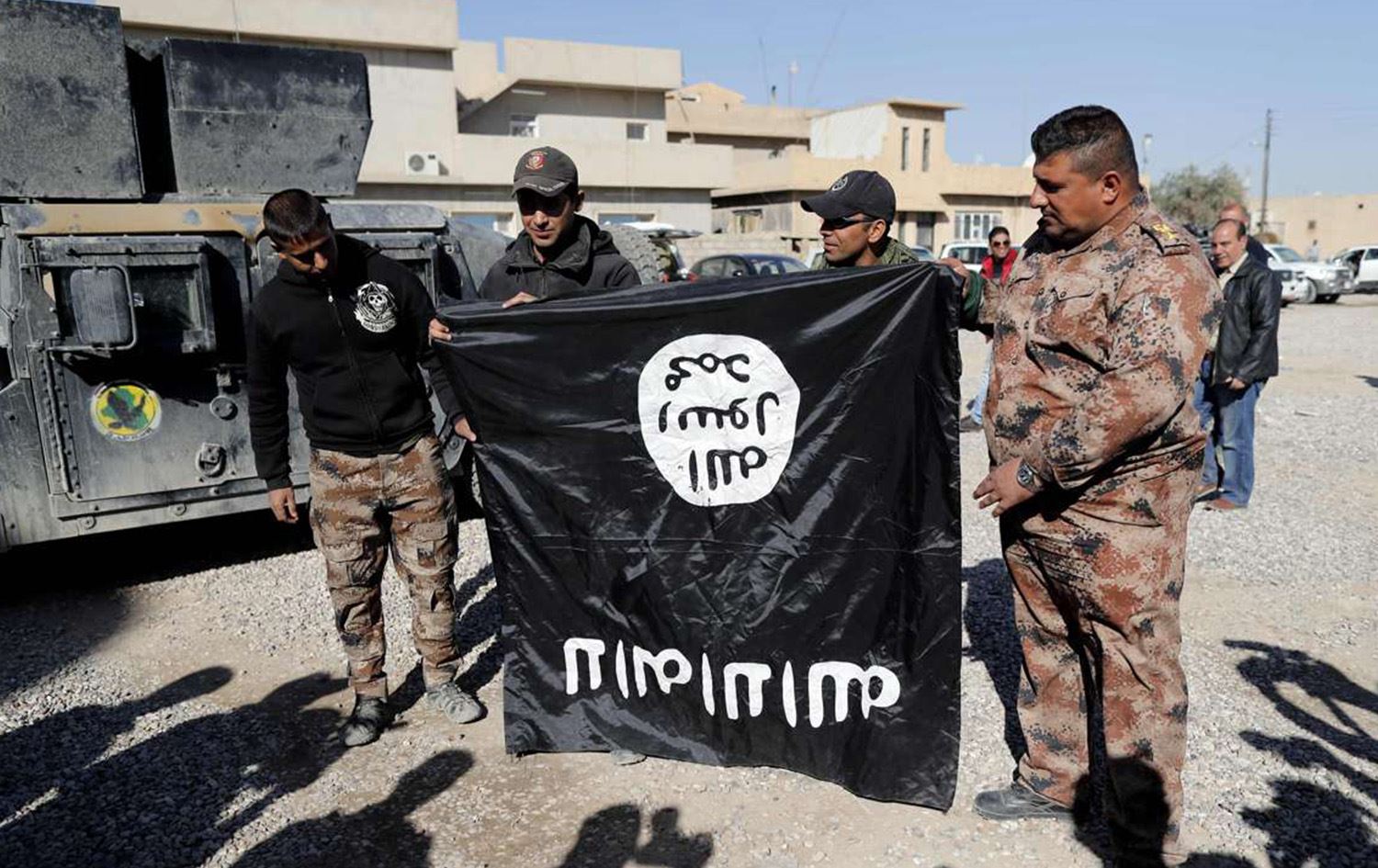 Iraqi army soldiers hold a captured flag from the Islamic State (IS) jihadist group upside-down on Wednesday, near an Iraqi army base in the outskirts of Mosul. Photo: AFP