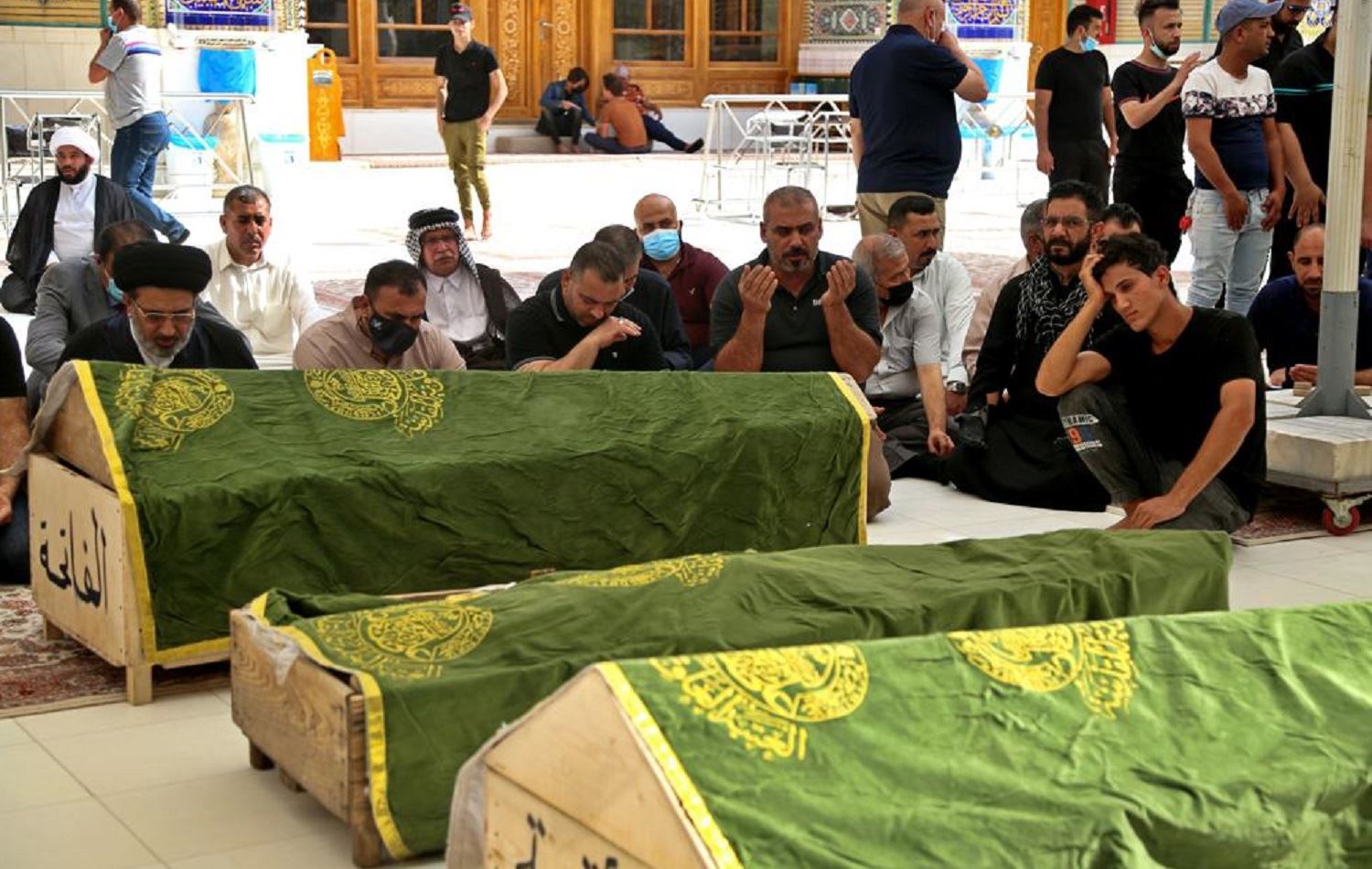 Mourners pray near the coffins of coronavirus patients who were killed in the Ibn al-Khatib hospital fire, during their funeral at the Imam Ali shrine in Najaf on April 25, 2021. Photo: AP / Anmar Khalil