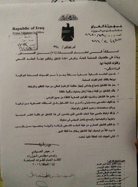 According to a document recently published in Iraqi media, Prime Minister Haider al-Abadi issued Ministerial order No (91) on February 22. “Reorder and restructure the Hashd al-Shaabi and its affiliated forces based on article 78 of the constitution and in the interest of the public,” reads the order.