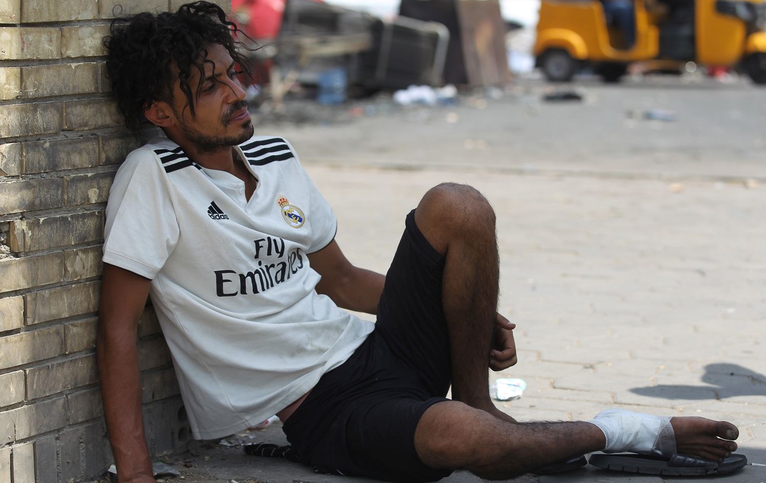 An Iraqi protester wounded the previous night in confrontations with security forces sits on July 27, 2020 on the ground in Baghdad's Tahrir square, where several protest tents were burnt the previous night. Photo: Ahmad al-Rubaye / AFP