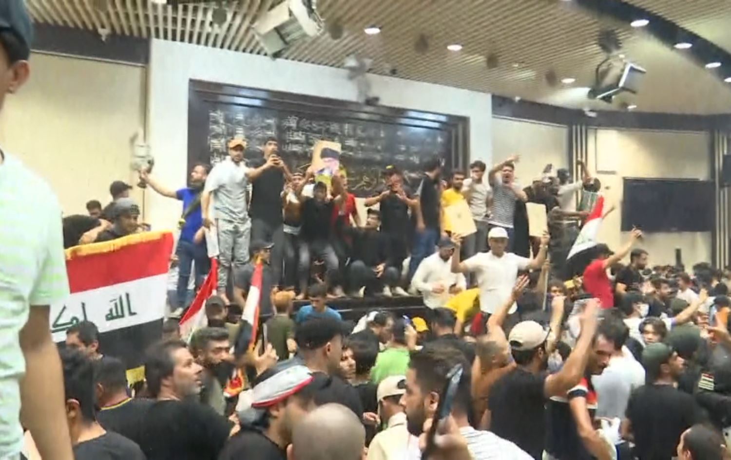 Protesters enter the Iraqi parliament building on July 27, 2022 to protest the candidacy of a politician by the Coordination Framework for the position of prime minister. Photo: AP/screengrab